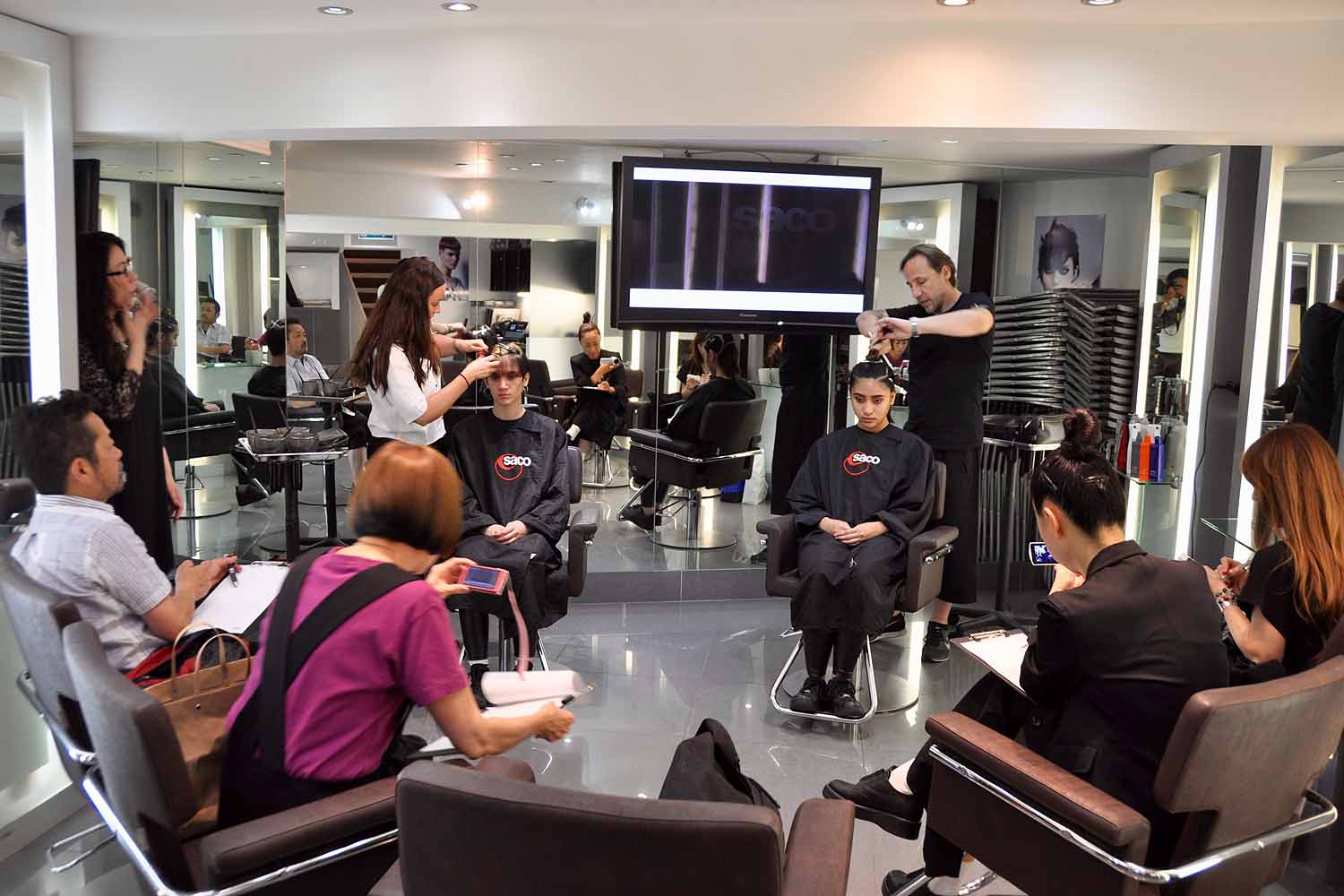 ↑リチャードがカットのテクニックを教えてくれます。因みにうちのオーナーがサスーンにいた時の同僚。