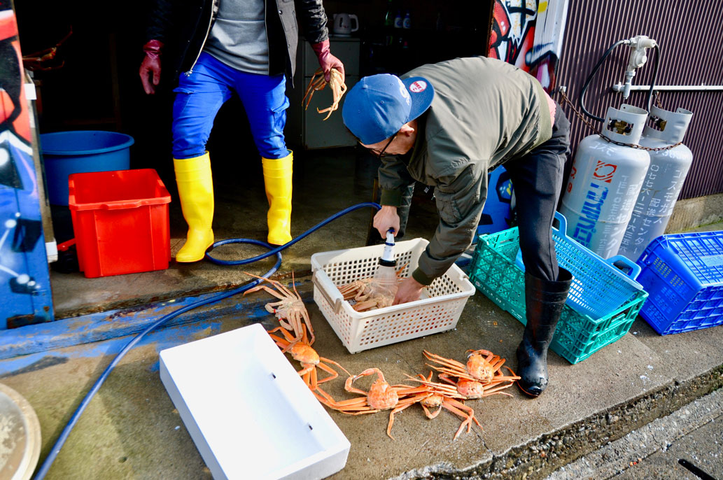 蟹を真水で絞める様子。絞めが甘いと足が取れてしまい商品価値が下がってしまうので重要な作業。