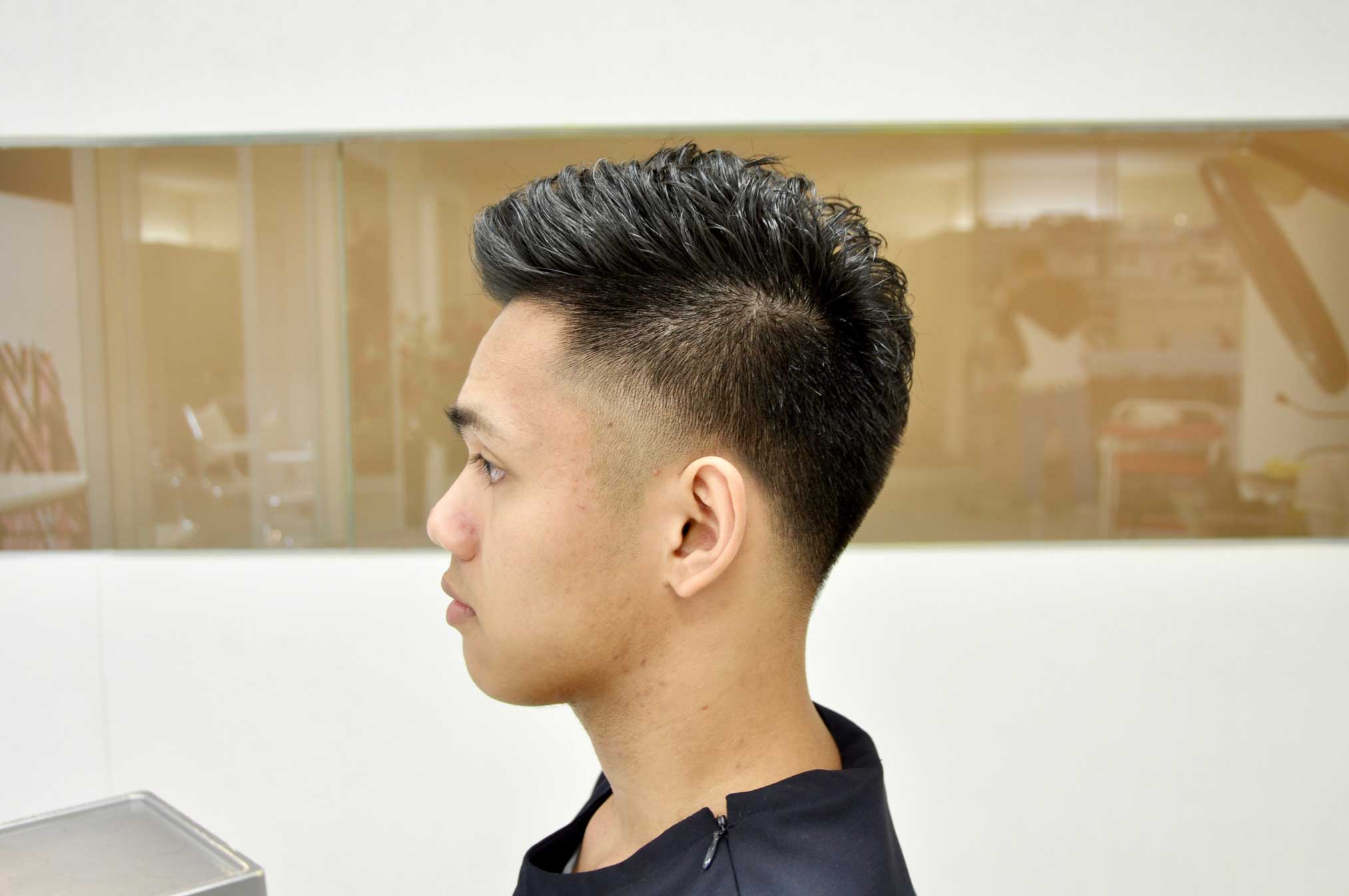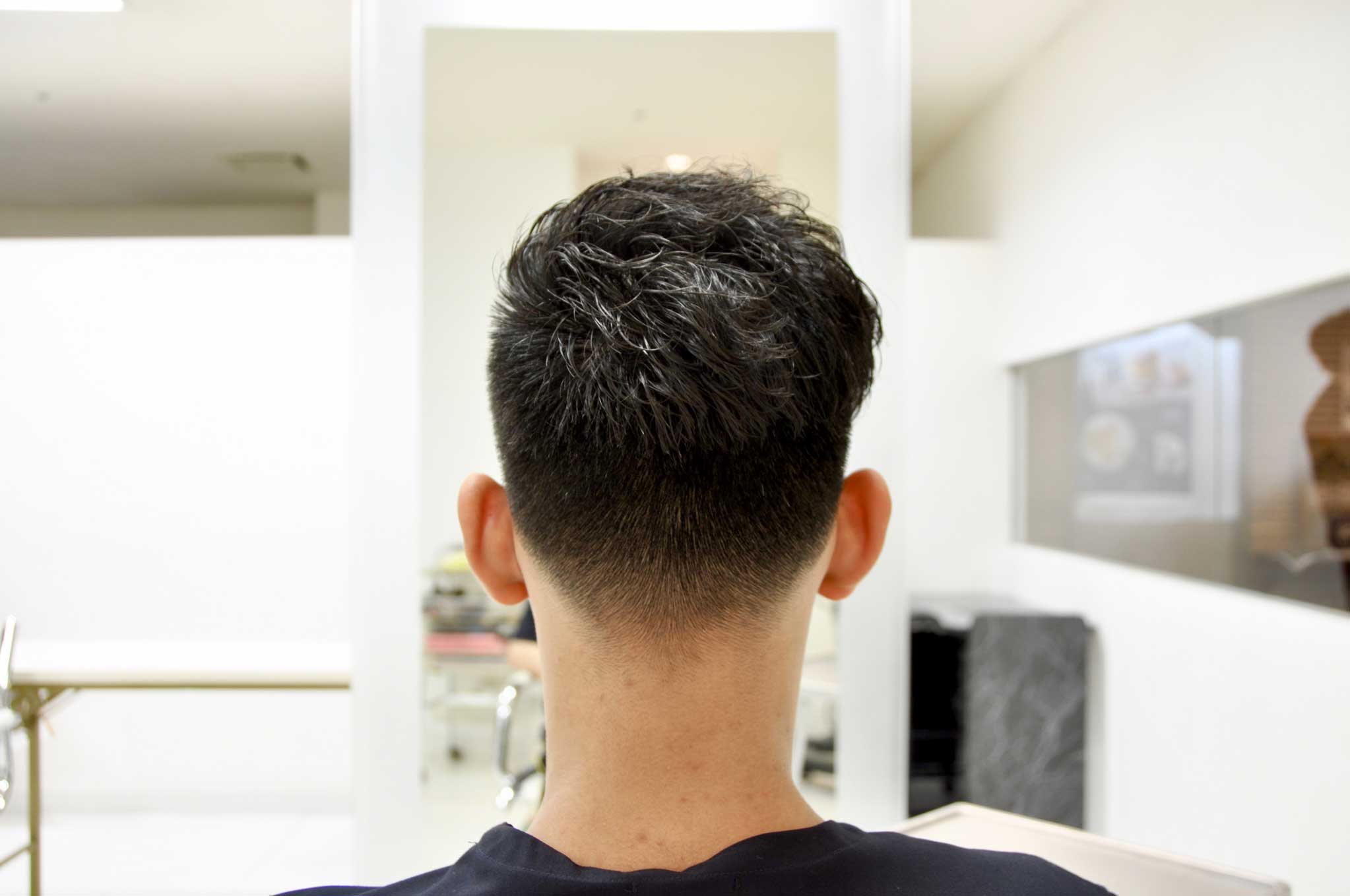 ローフェードで刈り上げ、トップにパーマをかけ、